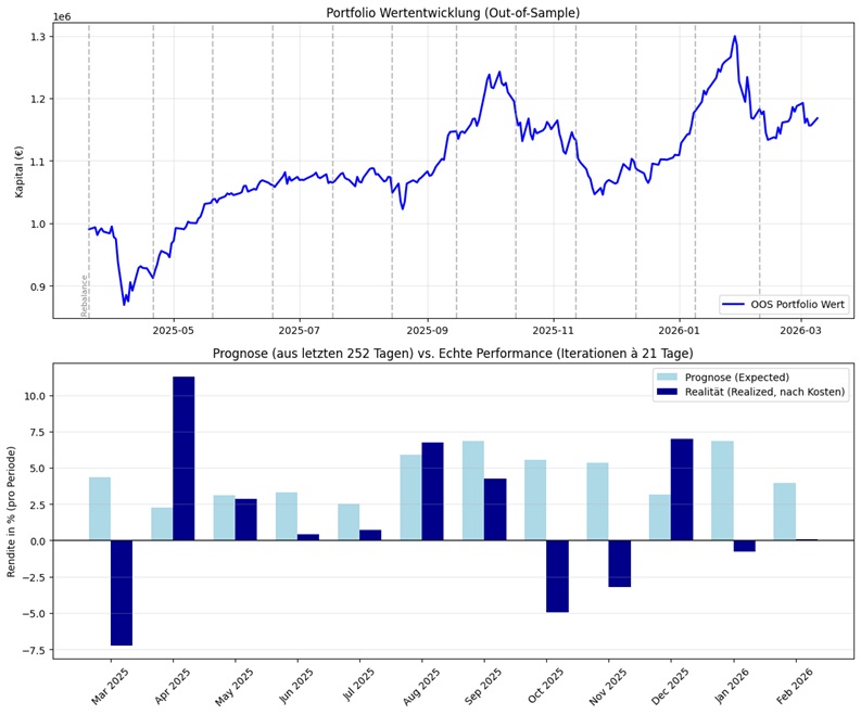 Im Backtest wird das Trainingsfenster (z.B. alle 21 Tage) weitergerollt. Wenn sich das Portfolio ändert, fallen reale Umschichtungskosten an, die exakt berechnet werden müssen.