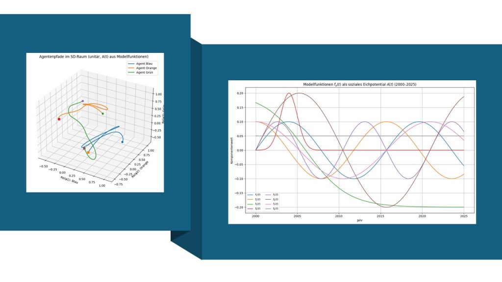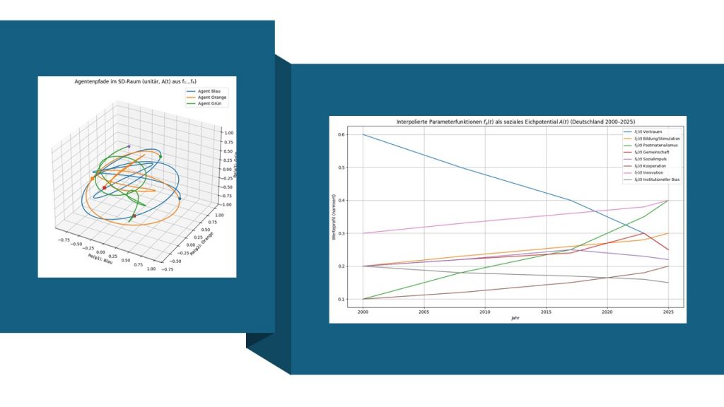 Tabelle 1: Übersicht der Parameterfunktionen mit einer vereinfachten Kalibrierung auf der Basis von Aussagen von OECD, EVS/WVS und Edelman Trust Barometer. Anmerkung zu f8, dem Institutionellen Meta-Bias: Der Meta-Bias (Parameterfunktion und Lambda 8 Generator) steht für den kulturellen Rahmenparameter, auf dessen Basis Systemstabilität und Vertrauen entstehen können. Ein hoher Meta-Bias bedeutet, dass Konflikte zwischen den Werten (blau, orange, grün) durch institutionellen Zusammenhalt abgefangen werden. Sinkt er, verliert die Gesellschaft ihre kohärente Handlungsfähigkeit.
