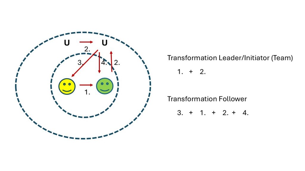 Abbildung 1: Diese Abbildung skizziert die Rückkopplung von individueller Transformation und Kontext-Transformation. Der Kontext wird mit U für Umfeld gekennzeichnet und die Individuen durch Smileys. Ein oder mehrere Individuen agieren im Team als Transformation Leader bzw. Initiator. Es kann notwendig sein, dass sie ihr Mindset für die anstehende organisationale Transformation selbst ändern. – Dies wird durch den Übergang 1. angedeutet. In jedem Fall ist es wichtig, dass das Transformation Team ein gemeinsames Bild, ein Collective Mind, von der Kulturpotential-Transformation entwickelt. Das Umfeld U wird auf dieser Basis einer ersten Transformation, angedeutet durch 2., unterzogen. Das geänderte Umfeld wirkt auf die Transformation Follower und Leader, angezeigt durch 3. und 4., zurück. Diese verändern ihr Verhalten, ggf. sogar ihre Werte und Glaubenssätze, und transformieren ihrerseits das Umfeld wieder, angezeigt durch 2. Das geänderte Umfeld wirkt auf die Individuen zurück, angezeigt durch 4.. Es entsteht iterativ ein selbstkonsistenter Transformationsprozess, der im Idealfall einem Plan-Do-Check-Adapt (PDCA) Prozess folgt [1].
