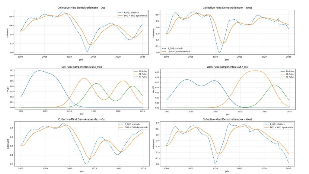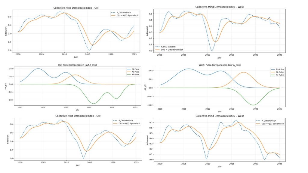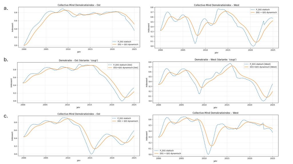 Im Westen hält sie bis 2014 gut durch, fällt dann extrem stark ab, kann sich zwar wieder bis 2020 erholen, fällt danach aber stetig bis 2025. Deutlich wird: Zu viel Streit und Polarisierung drücken das Niveau schnell, während anhaltende, sichtbare Zusammenarbeit es hebt. Debatten helfen nur, wenn sie fokussiert bleiben und mit konkreter Umsetzung verbunden sind – endloses Reden ohne Ergebnisse schadet. Im Osten wirken zuerst De-Eskalation und klug gestaltete Beteiligung; darauf könnten! Integrations- und Aufbauprojekte erfolgreich aufbauen. Im Westen braucht es vor allem spürbare Verbesserungen im Alltag und in der Verwaltung, bevor große Debatten tragfähig werden könnten! Der Blog-Beitrag ist explorativ, er liefert keine endgültigen Wahrheiten, sondern gut nachvollziehbare Handlungs-Orientierungen. Die Kernbotschaft ist: Weniger Polarisierung, mehr fokussierter Diskurs und früh sichtbare gemeinsame Erfolge stärken die demokratische Qualität.