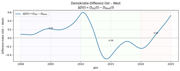 Abbildung 5: Diese Abbildung zeigt den Unterschied im Demokratie-Index von Ost und West, auf der Basis der Berechnungen zu Abbildung 4. Die in der Abbildung enthaltenen Zahlen zeigen den jeweils gemittelten Demokratie-Unterschied für verschiedene Zeiträume: 0.20 für den Zeitraum 2000-2010, -0.09 für den Zeitraum 2010-2020 und 0.09 für den Zeitraum 2020-2025. Dies bedeutet, dass in diesem Fall bis 2010 der Demokratieindex für Ost-Deutschland deutlich höher war als für West-Deutschland und im Zeitraum danach sich im Mittel keine Unterschiede zeigen.